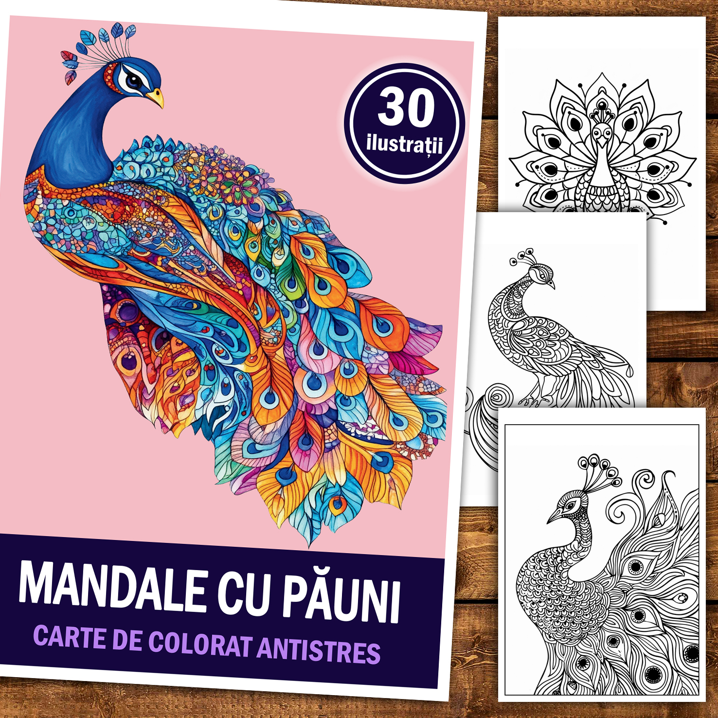 Carte de colorat antistres , 30 de ilustratii Mandale cu pauni, 66 pagini