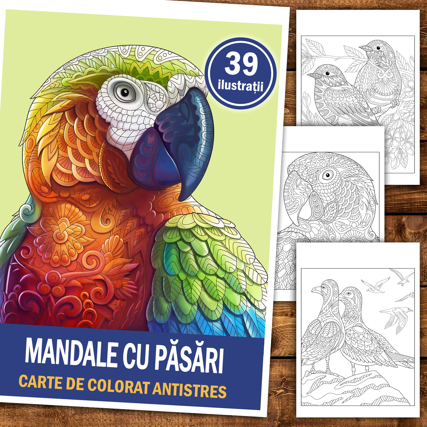 Carte de colorat antistres , 39 de ilustratii Mandale cu Pasari, 84 pagini