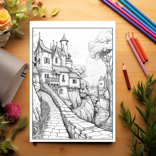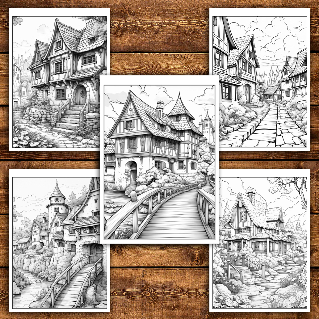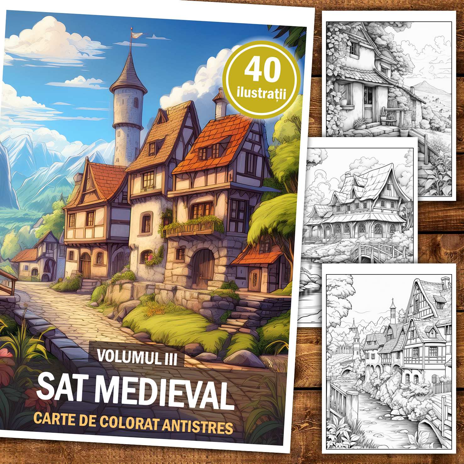 Carte de colorat antistres , 40 de ilustratii Sat Medieval - Volumul III, 86 pagini