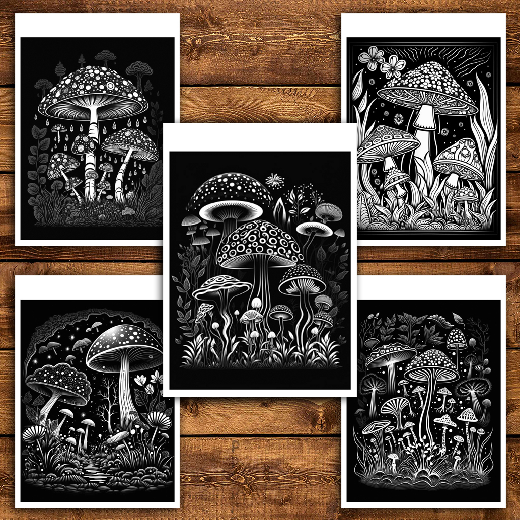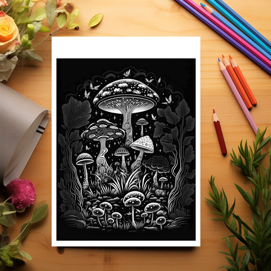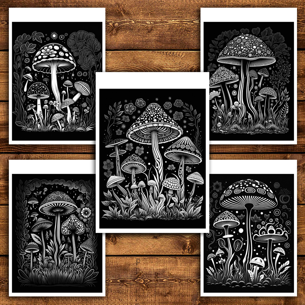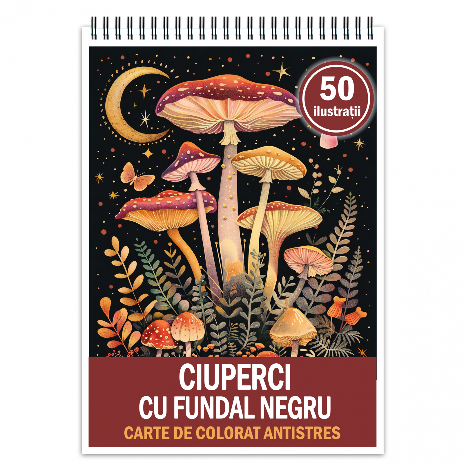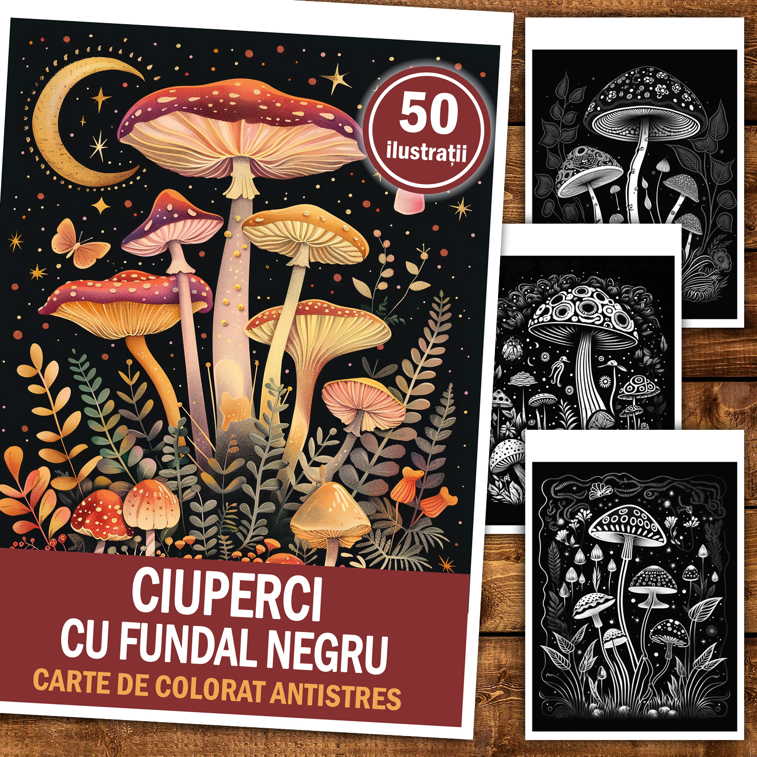Carte de colorat antistres , 50 de ilustratii Ciuperci cu fundal negru, 106 pagini