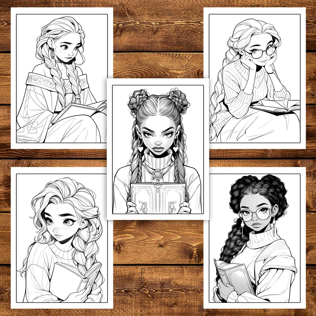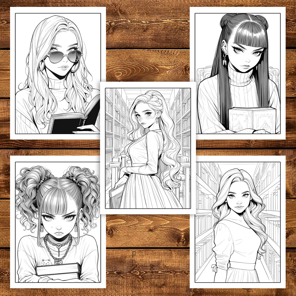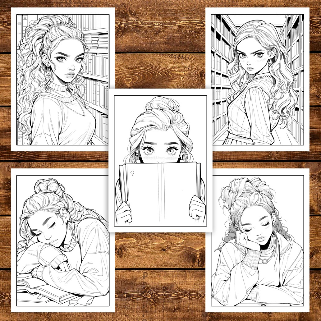 Carte de colorat pentru adulti, 50 de ilustratii, Anime Girls With Books, 106 pagini