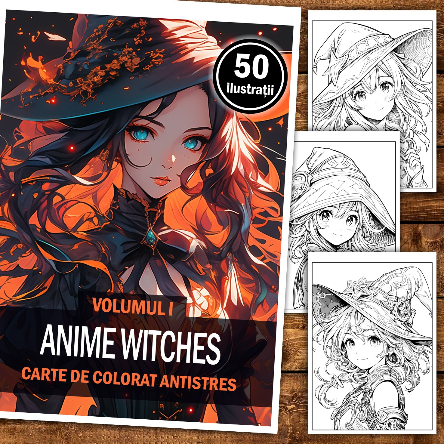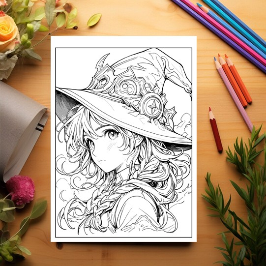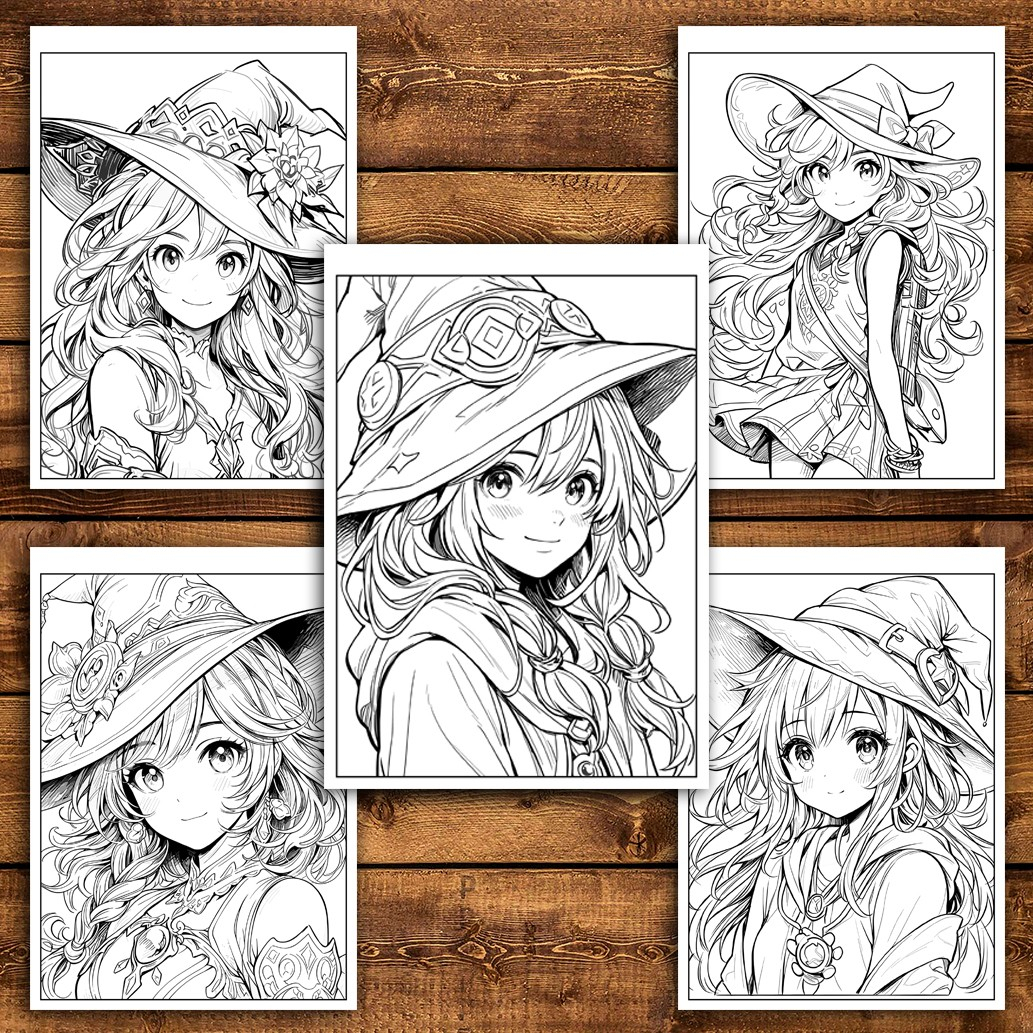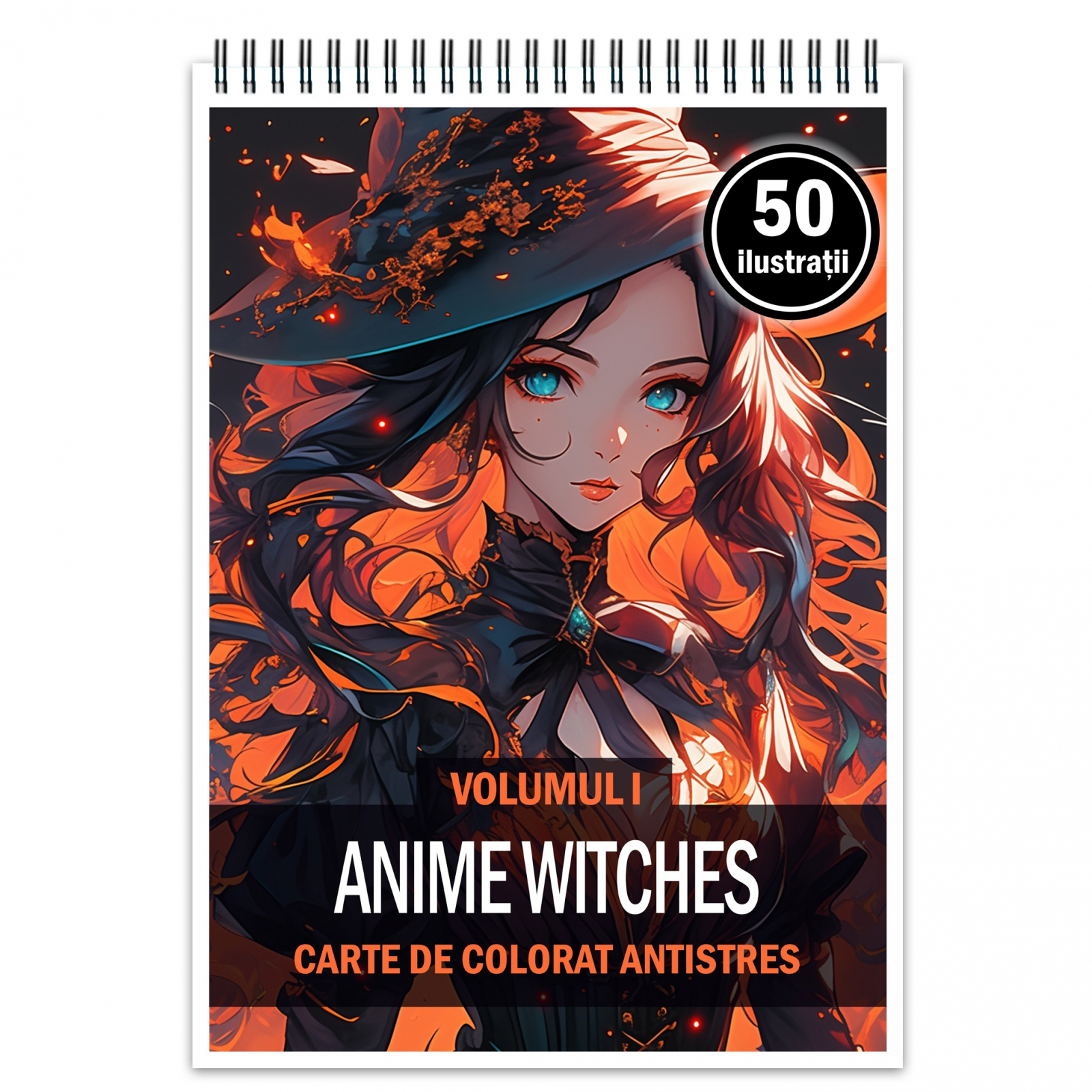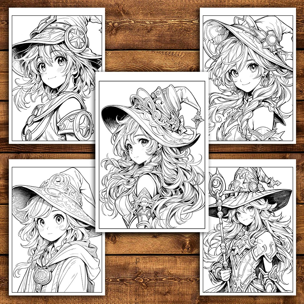 Carte de colorat pentru adulti, 50 de ilustratii Anime Witches, 106 pagini