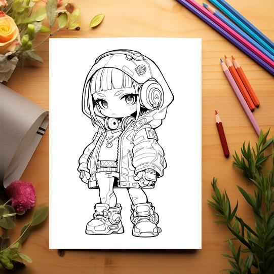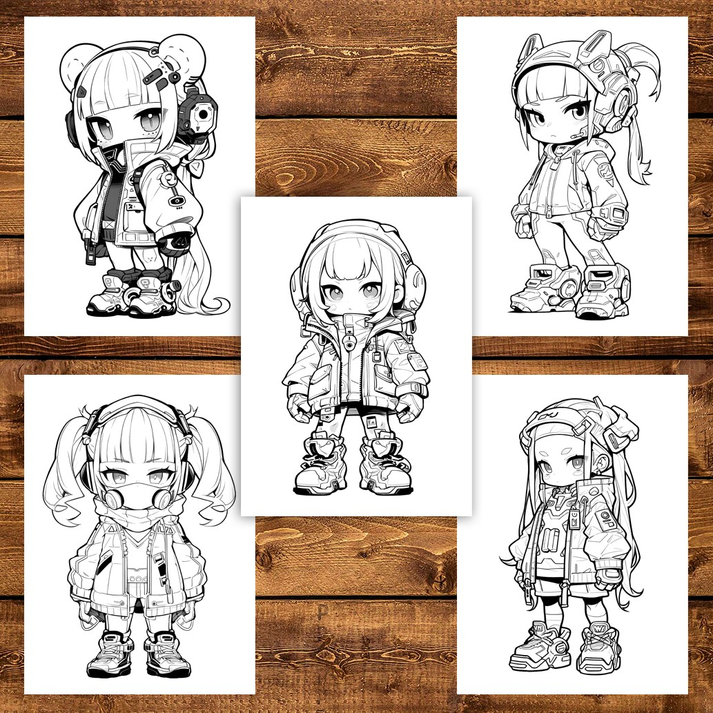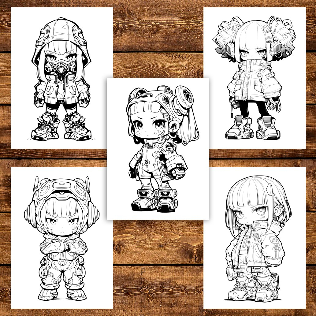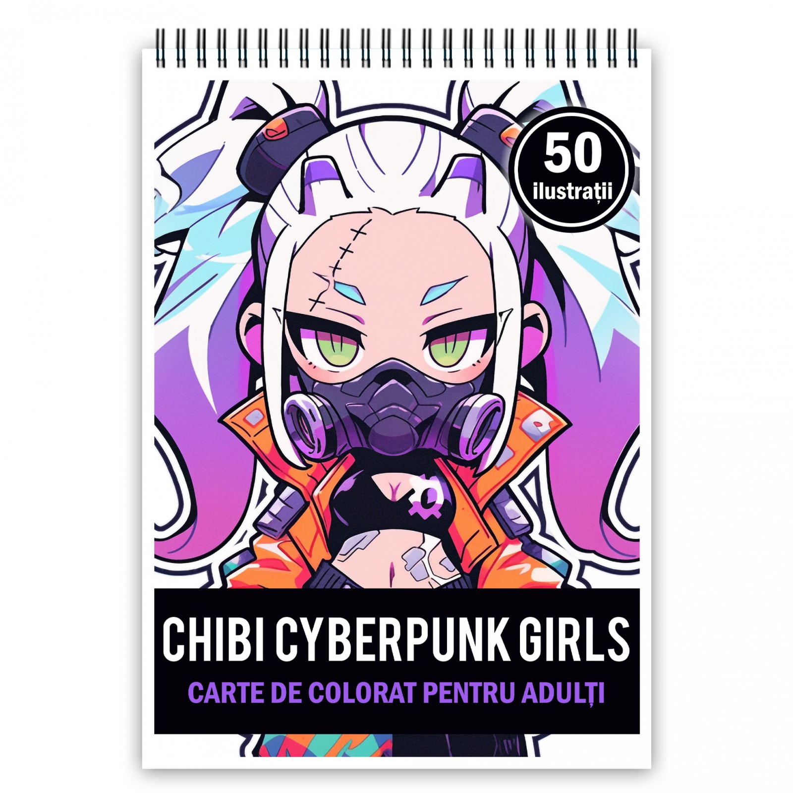 Carte de colorat pentru adulti, 50 de ilustratii Chibi Cyberpunk Girls, 106 pagini