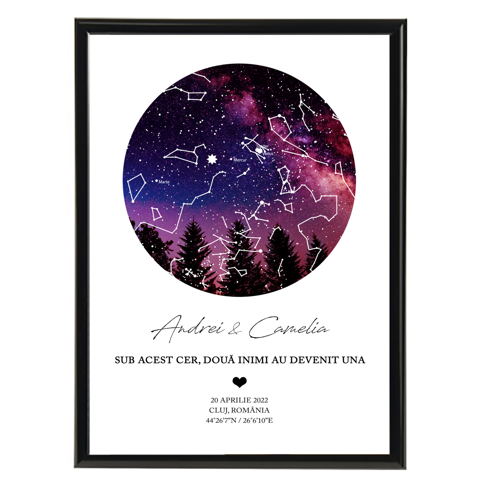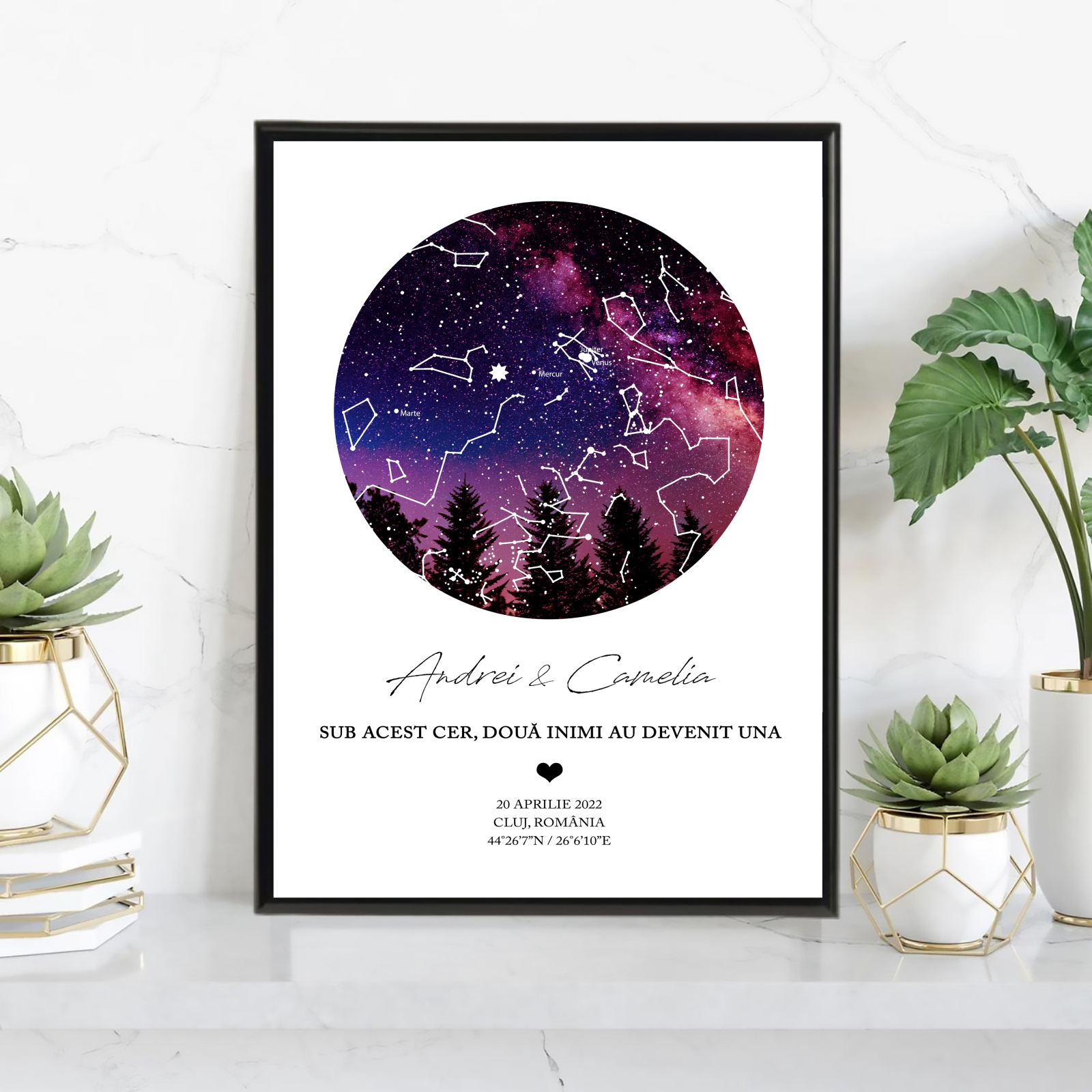 Harta stelelor imbina precizia astrofizicii cu eleganta artei, creand o amintire de neuitat. Stelele, care stralucesc mereu deasupra noastra, devin martorii vizibili ai celor mai frumoase momente.