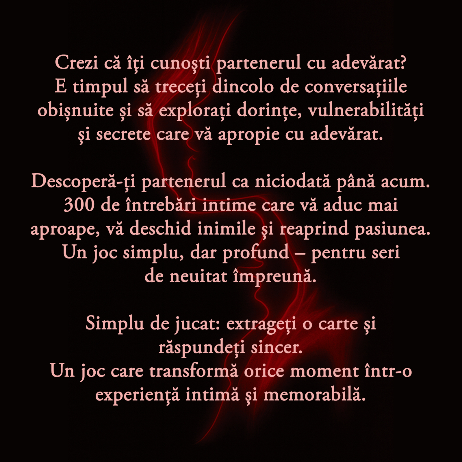 Daca jocul original Sa te cunosc mai bine a deschis conversatii frumoase si profunde, Editia Intima este pasul urmator: o invitatie de a explora cele mai sensibile si pasionale colturi ale relatiei voastre.