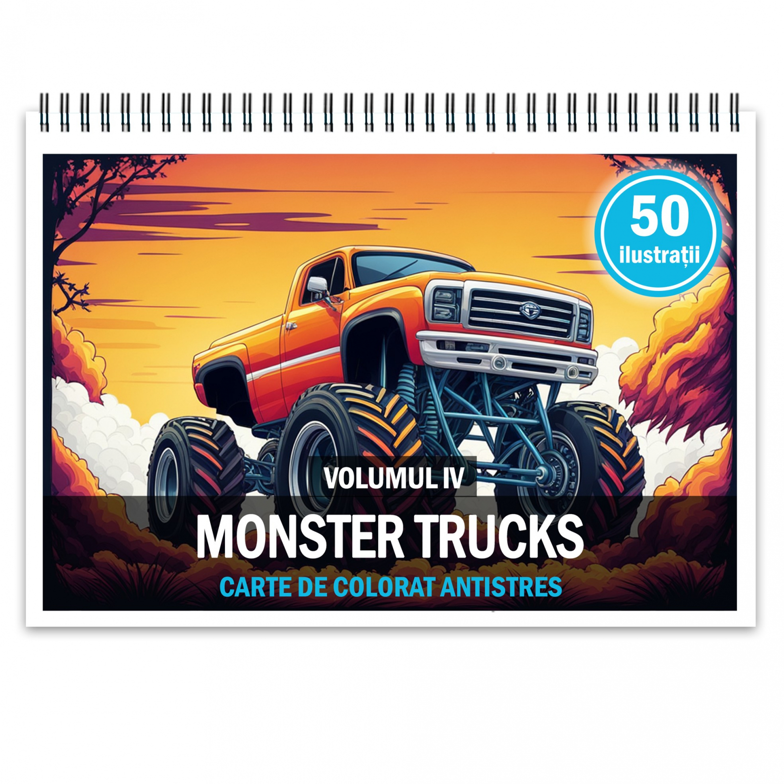 Carte de colorat pentru relaxare si antistres, 50 de ilustratii, Monster Trucks - Volumul IV, 106 pagini
