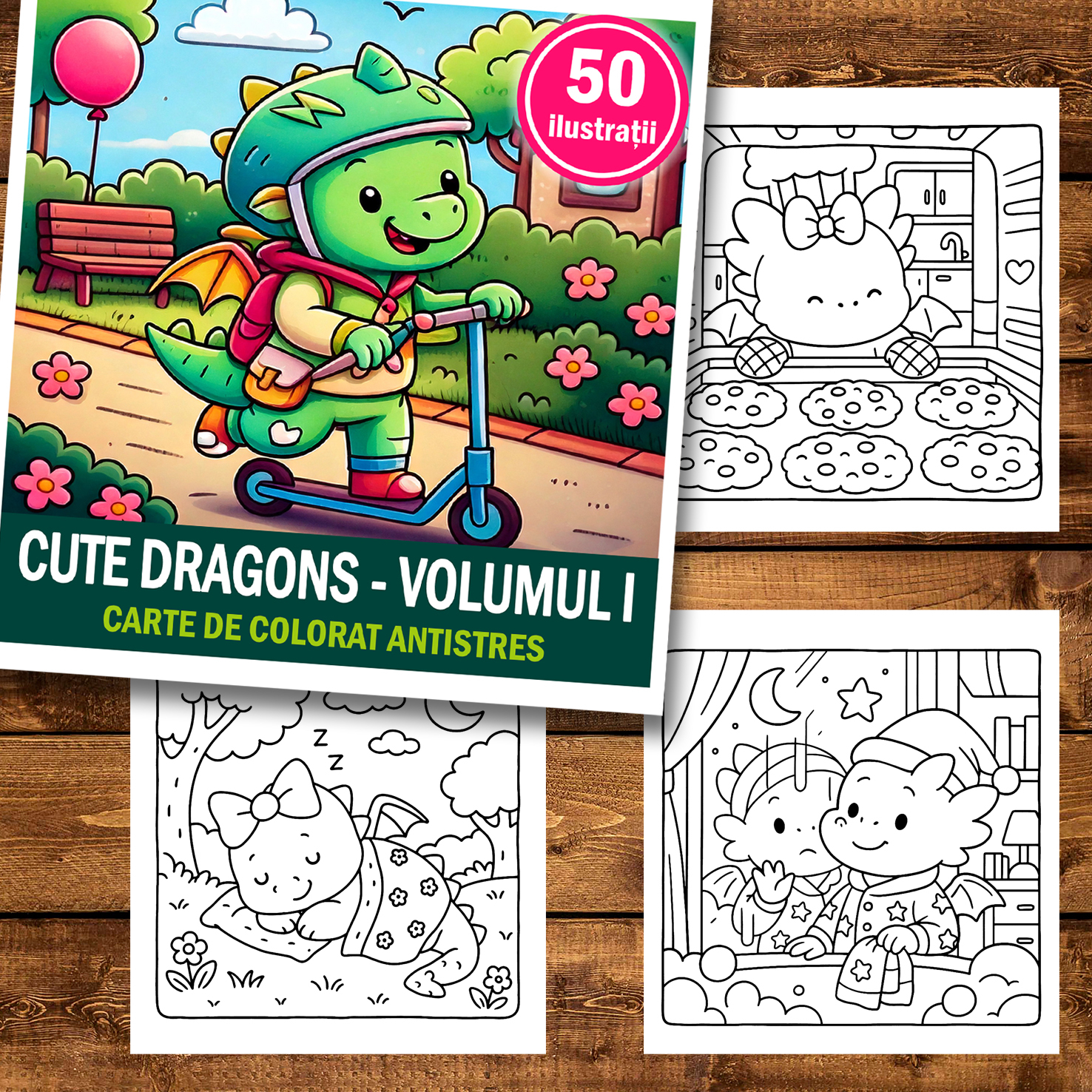 Carte de colorat antistres , 50 de ilustratii Cute Dragons - Volumul I, 106 pagini
