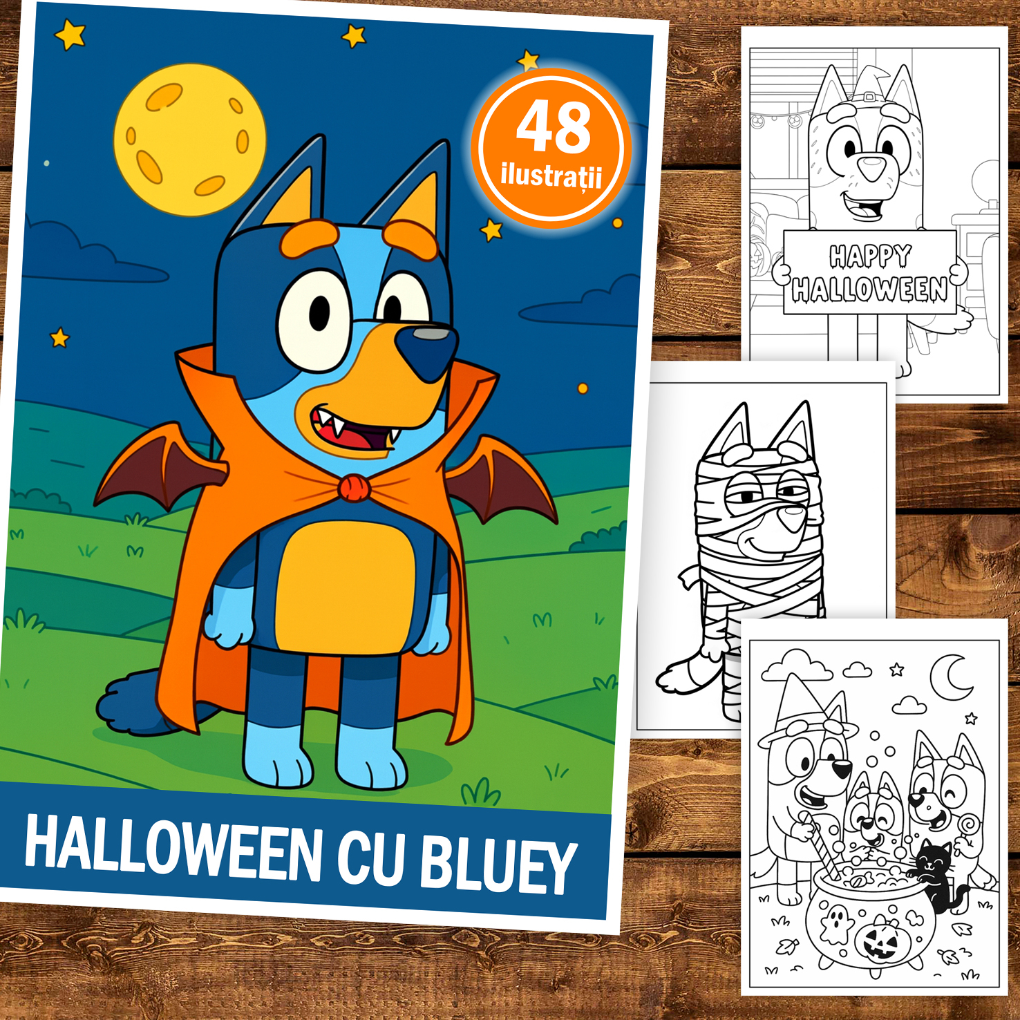 Carte de colorat pentru copii, 48 de ilustratii Halloween cu Bluey, 102 pagini